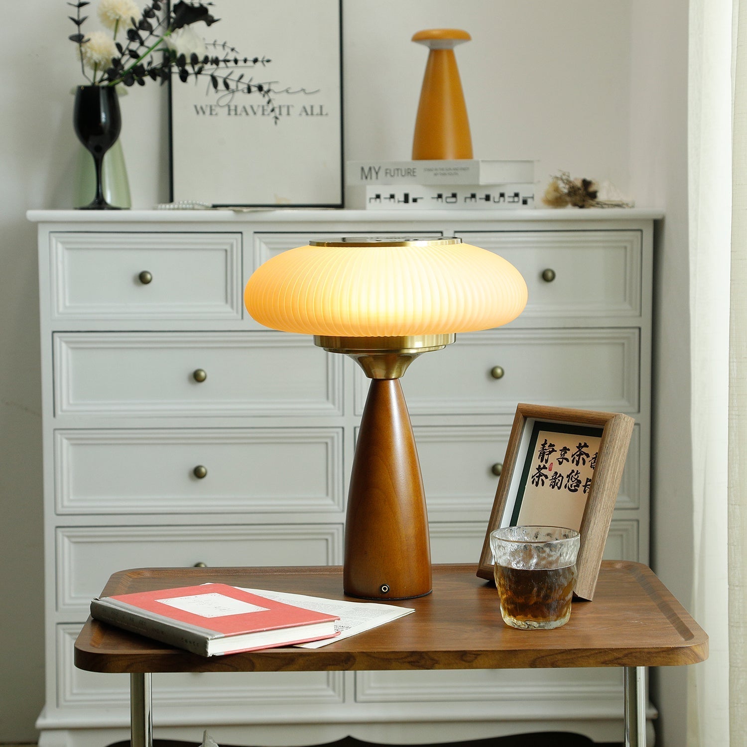 The glass shade gently diffuses light, creating a cozy, inviting atmosphere for bedrooms, living rooms, or studies.